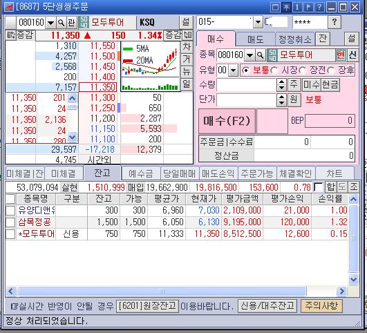 모두투어는 오후에 재차 11300원 부근 750주 매수, 삼목정공은 6050원에 1500주 매수 하였습니다.